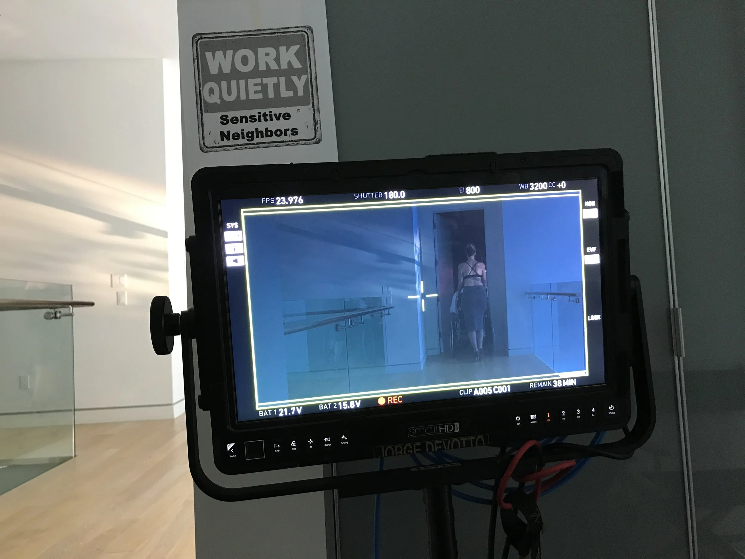 The main challenge: the stunning location in the Beverly Grove neighborhood of LA was flooded with natural lighting. Led by the film’s Director of Photography Paola Trulin, Gaffer Heath Gresham and team had to cover as many windows as possible. The home had an open concept layout, a bright, neutral pallet, and a high-end contemporary approach to its interior design. (Pictured below) Filming downstairs required scheduling all shots facing away from the sun-drenched patio to be filmed first. Production had to wait until 8 PM to turn around and get all the shots facing the patio. In this short period of time, production needed to make sure to get all the necessary coverage to match the previous shots. The most demanding and complex shots were in the upstairs corridor. (Pictured below) There were skylights in the ceiling that simply could not be covered. The solution would be to create dramatic shadows that could be enhanced in post-production. These shots relied heavily on color correction.